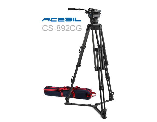 The CS-892CG(F) Professional Tripod System from Acebil includes a 100mm CH8(F) fluid head, T2002C carbon fiber tripod, GS-5 ground spreader, and an S-50 carry case. The tripod features a two-stage design and carbon fiber construction that supports loads up to 25kg / 55lb. It provides a height range from 63-171cm / 24.8”-67.4” and comes equipped with a sliding quick-release plate and pan bar.