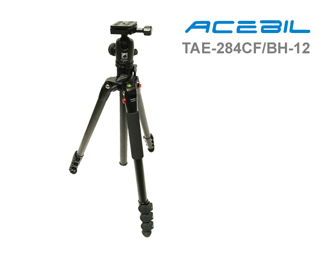 TAE-284CF/BH-12The TAE-284CF/BH-12 Professional Photo Tripod System features a 180 degree folding design for traveling. Built-in bubble level for precise positioning. Friction Control System allows you to modify the level of friction on the ball to accommodate changing equipment weight. Adjustable leg angles can be independently locked into place at three different angles and a Multi-Angle Central Column. Spring loaded weight hook allows assitional weight mounting stability during windy conditions. Alloy body minimizes weight. Dual threaded head platform assures compatibility with almost any tripod head and camera. Alloy body with carbon filber leg pipe & adjustable foot spike. Features large foam grips on all three legs for all-weather use.